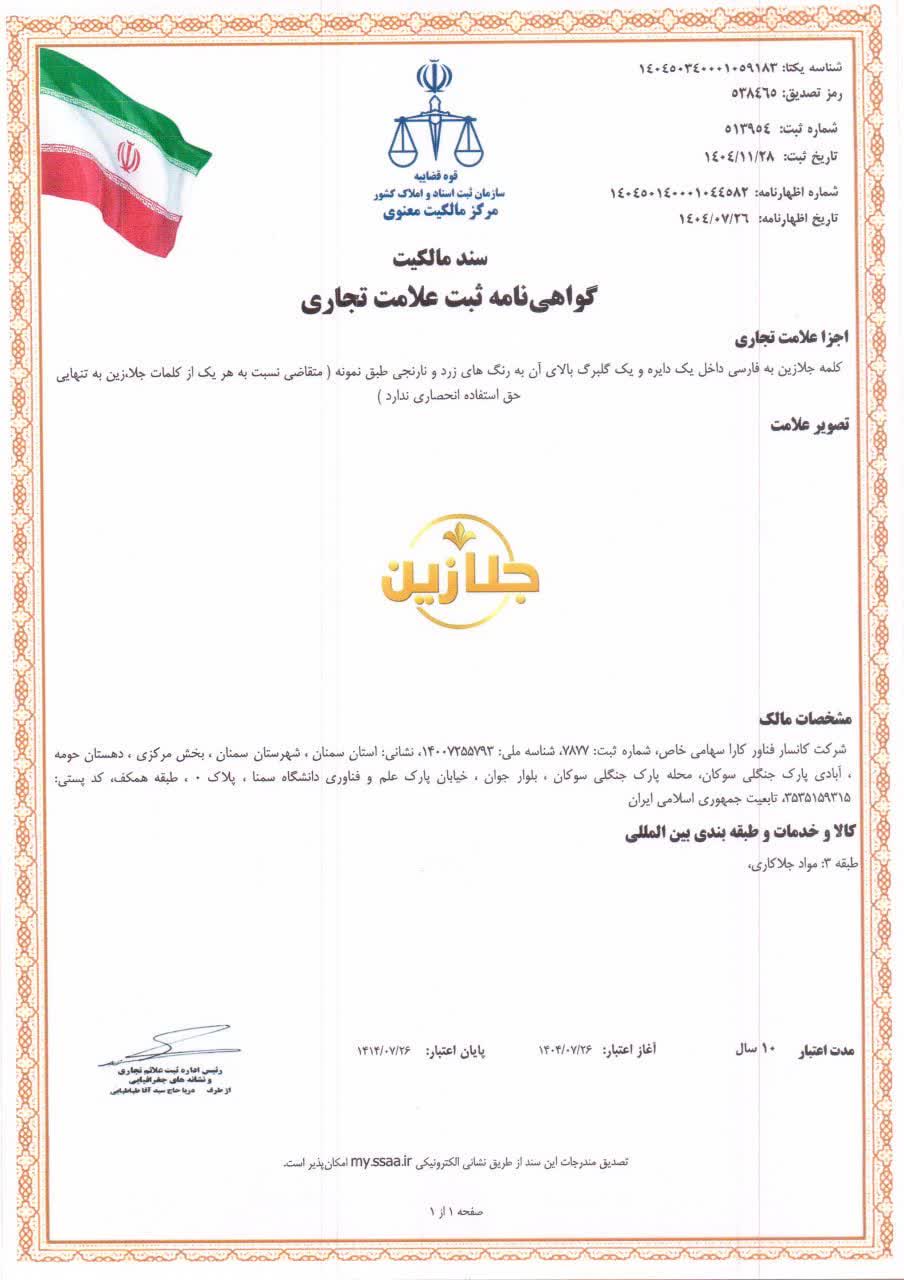 ثبت رسمی علامت تجاری «جلازین» توسط شرکت فناور کانسار فناور کارا