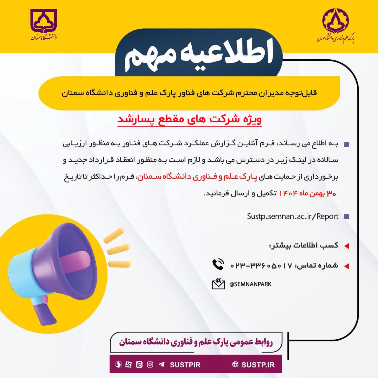 قابلتوجه مدیران محترم شرکت های فناور پارک علم و فناوری دانشگاه سمنان ( ویژه شرکت های مقطع پسارشد )