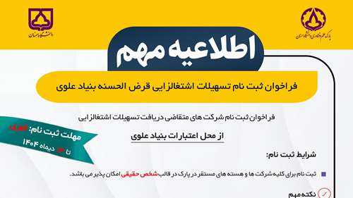 فراخوان ثبت نام تسهیلات اشتغالزایی قرض الحسنه بنیاد علوی 1404/10/09 - 09:21 تعداد بازدید: 140 زمان مطالعه : کمتر از یک دقیقه فراخوان ثبت نام تسهیلات اشتغالزایی قرض الحسنه بنیاد علوی اطلاعات بیشتر: 02333605011 خانم احمدیان ثبت نام در ایتا: @Park_Register کلمات کلیدی