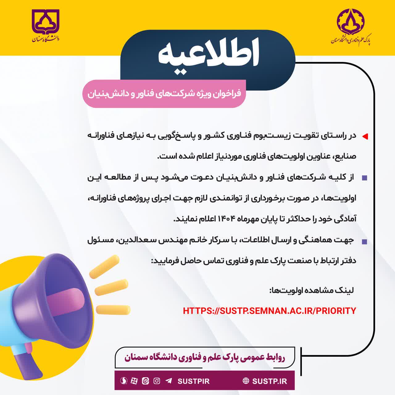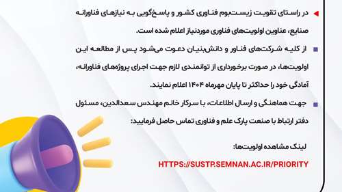 فراخوان ویژه شرکت های فناور و دانش بنیان 1404/07/06 - 14:09 تعداد بازدید: 122 زمان مطالعه : کمتر از یک دقیقه لینک مشاهده اولویت ها: https://sustp.semnan.ac.ir/Priority کلمات کلیدی