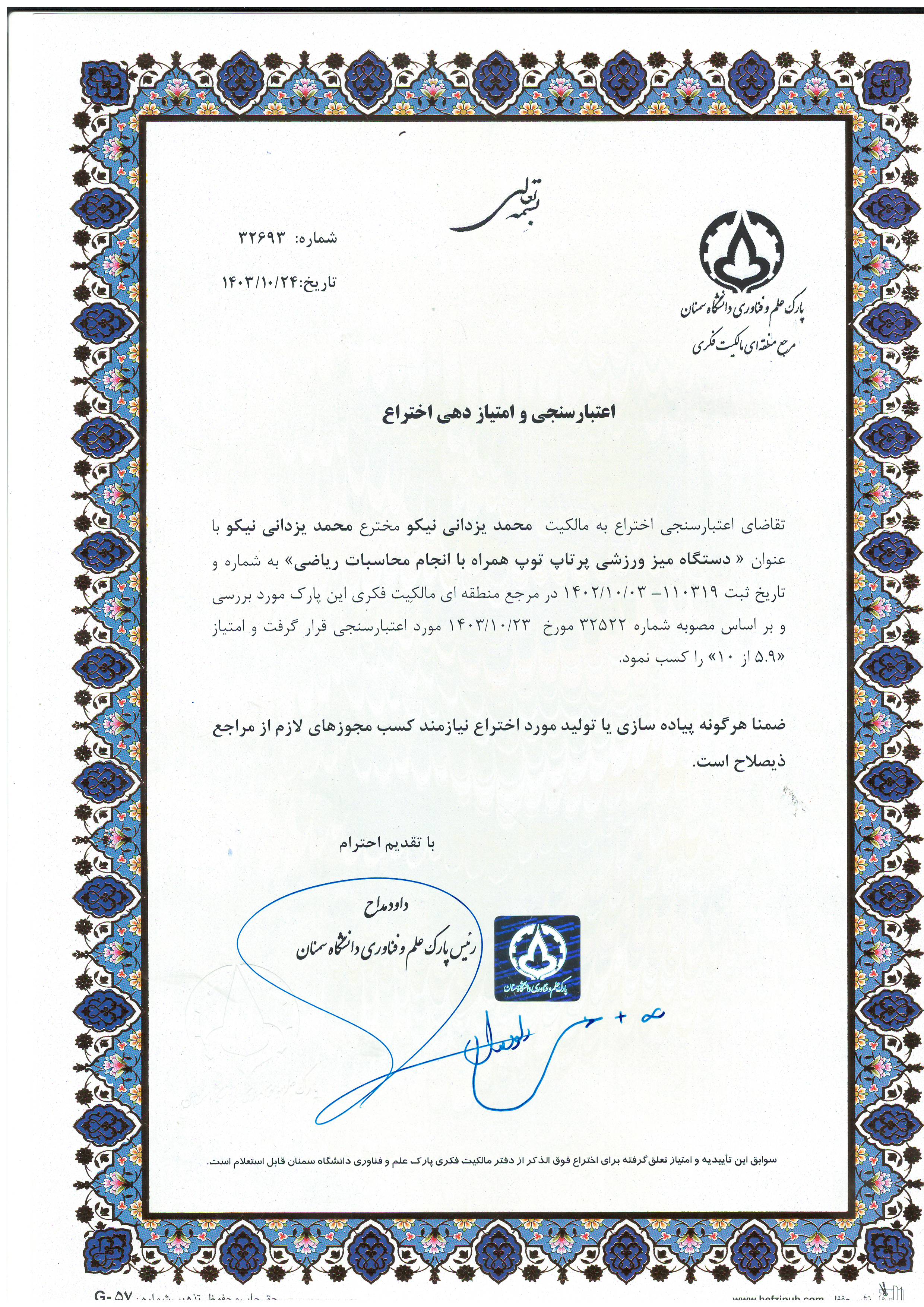 تأییدیه های علمی اختراع متعلق به واحدهای فناور مستقر در پارک علم و فناوری دانشگاه سمنان