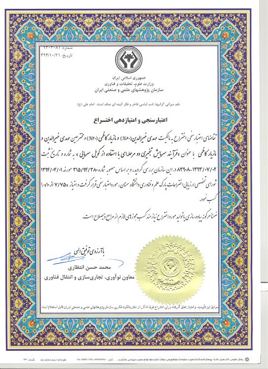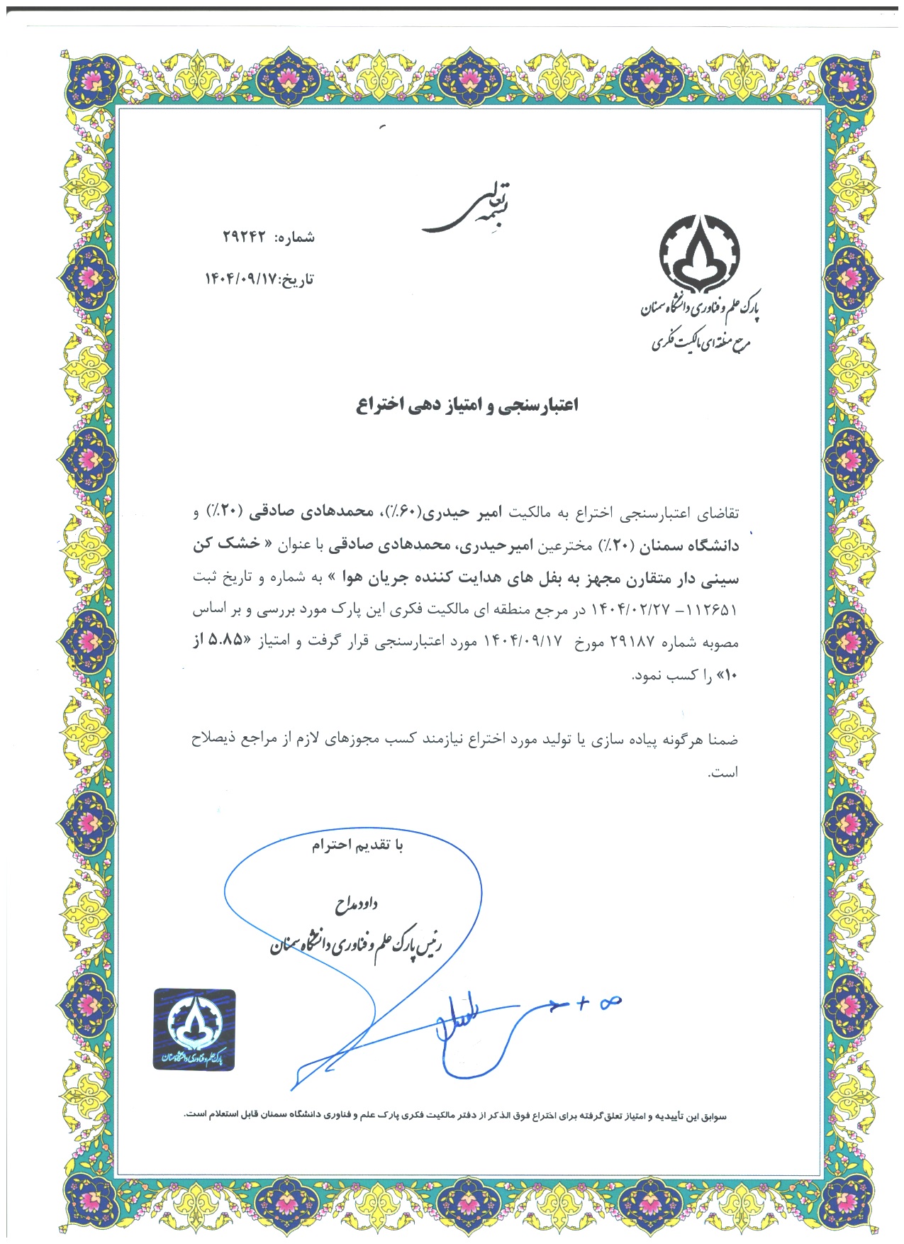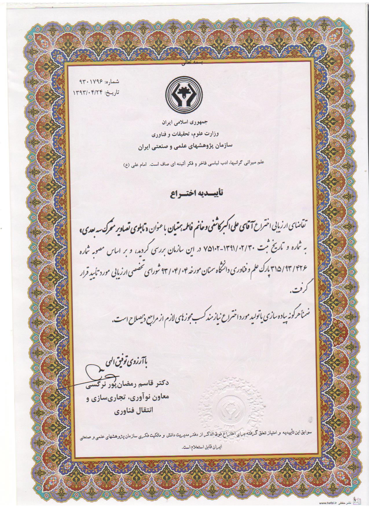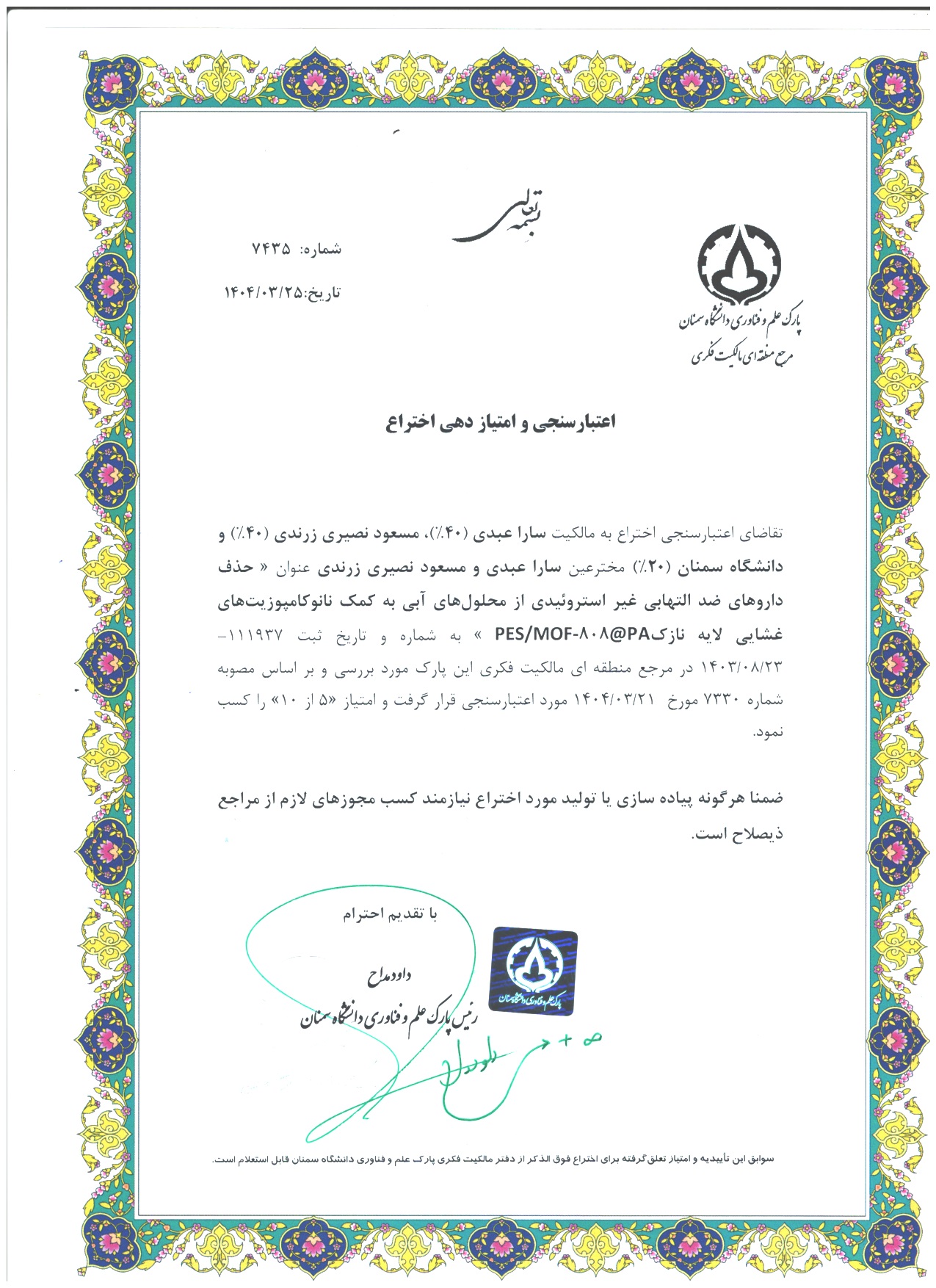 تأییدیه های علمی اختراع متعلق به «پارک علم و فناوری» و «دانشگاه سمنان»